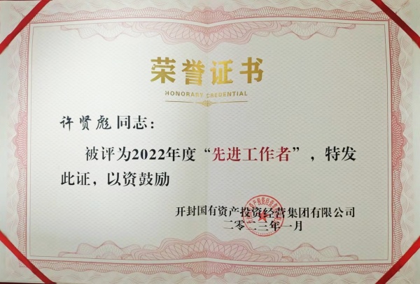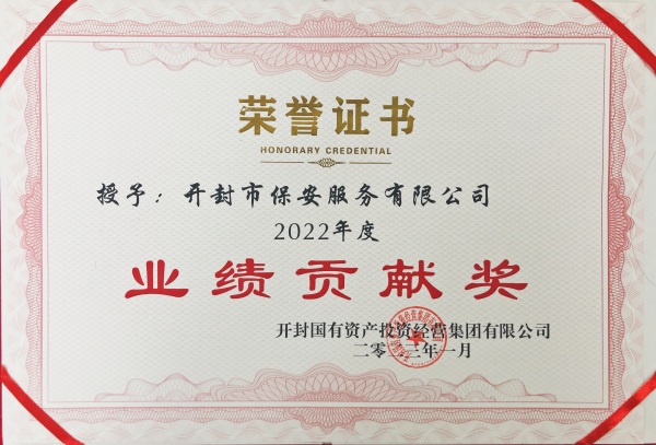2023年1月16日,在開(kāi)封國投集團召開(kāi)的2022年度年終總結暨表彰大會(huì )中,開(kāi)封市保安服務(wù)有限公司榮獲“2022年度業(yè)績(jì)貢獻獎”,公司員工許賢彪同志榮獲“2022年度**工作者”稱(chēng)號。