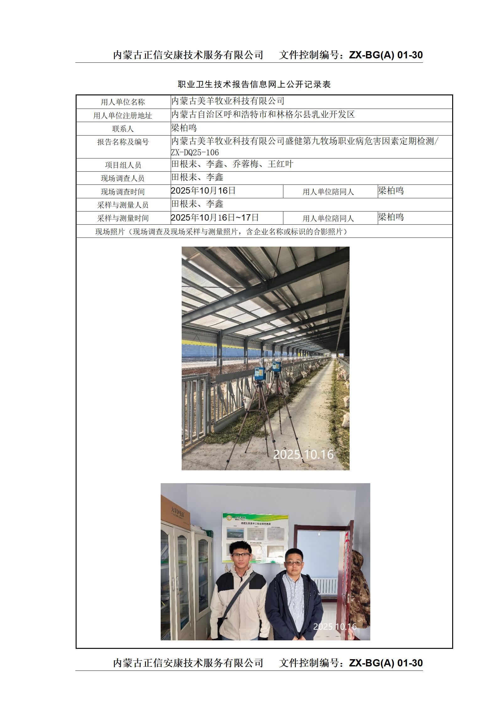 內(nèi)蒙古美羊牧業(yè)科技有限公司盛健第九牧場職業(yè)病危害因素定期檢測