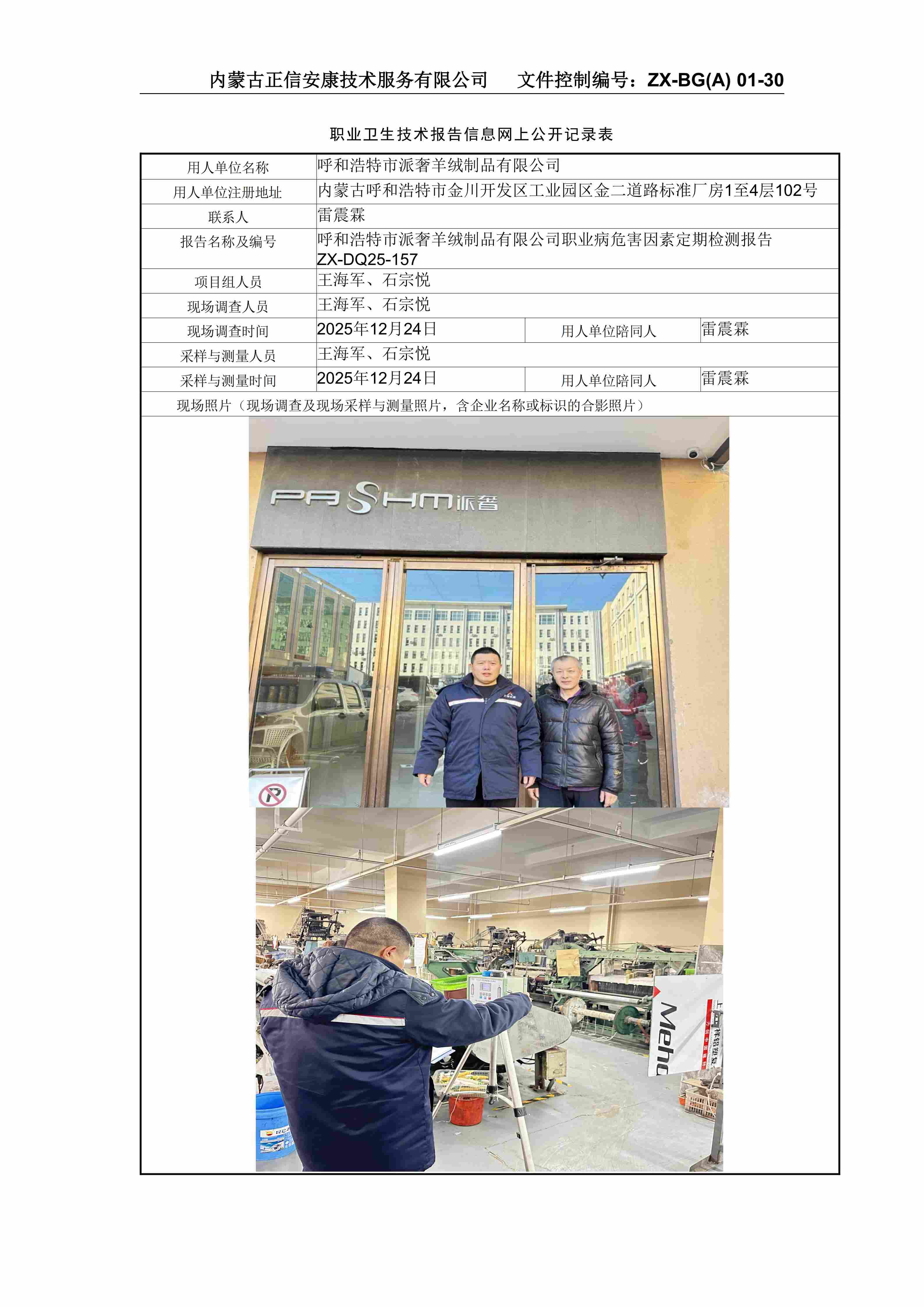 呼和浩特市派奢羊絨制品有限公司職業(yè)病危害因素定期檢測報告